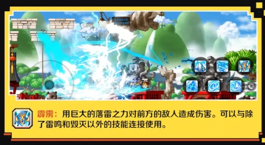 然后“霹雳”也是值得一提的重要核心技,它与召唤一条大鲨鱼扑杀对手的毁灭不同,它在使用后会直接召唤大规模的闪电来轰炸前方的敌人,该技能的伤害与范围完全不输毁灭,并且也是可以直接连接除“雷鸣”和“毁灭”以外的其他技能一起使用。