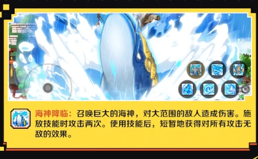 最后的“海神降临”则是一个范围更加巨大的AOE技能,使用后会直接召唤一条超大的鲸鱼拔地而起,基本上一个屏幕的敌人都会被它的冲撞和掀起的浪花所波及到,并且该技能的伤害分为两次,用完这招后奇袭者甚至还能获取到短暂的无敌状态!