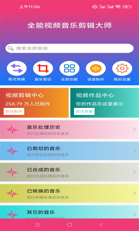 这是一款快捷好用的音频格式处理工具。在这里大家可以轻松的完成对音频格式的转换操作。同时他还有音频剪辑以及音频合并和提取专业音频的处理功能。如果大家没有这方面经验的话,还可以通过一键操作完成各种音频的处理。