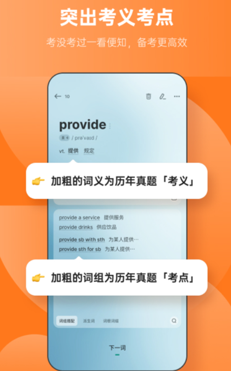 可以选择年级或者是考试种类来更新词库,除了有单词的发音一句释义之外,更是提供了多个例句来整理出单词的不同用法和场景,软件会将考点内容加粗处理,然后我们可以有针对性地进行复习。