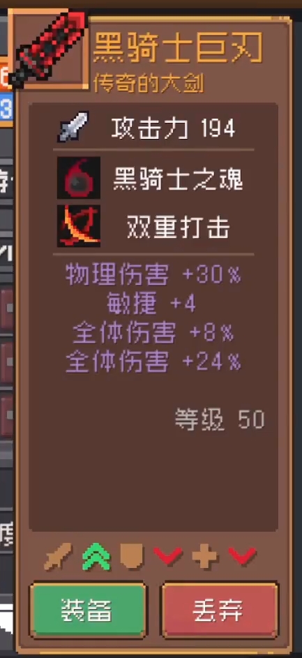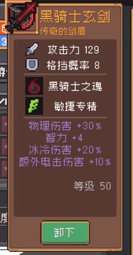 然后第二把“黑骑士玄剑”也是非常不错的,它的属性相比巨刃来说会更加全面一些,同时提供了129的攻击和8的格挡概率,前者能增加角色的伤害,后者则一定程度上加强了承伤能力,算是攻防兼顾的强力武器。