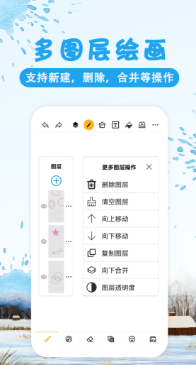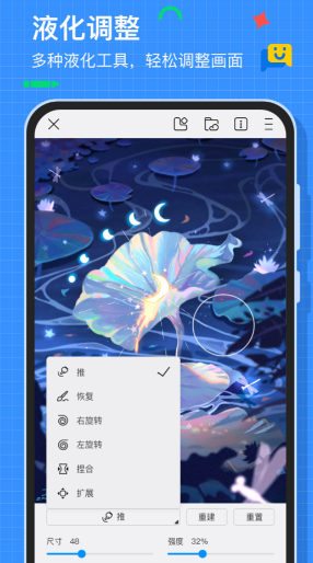 除了基础的绘画功能之外,这款软件还提供了液化、锐化、印章、涂抹等众多实用工具,软件还带有多图层修改模式,可以通过手指进行复杂的调整操作,从而取得我们想要的效果。
