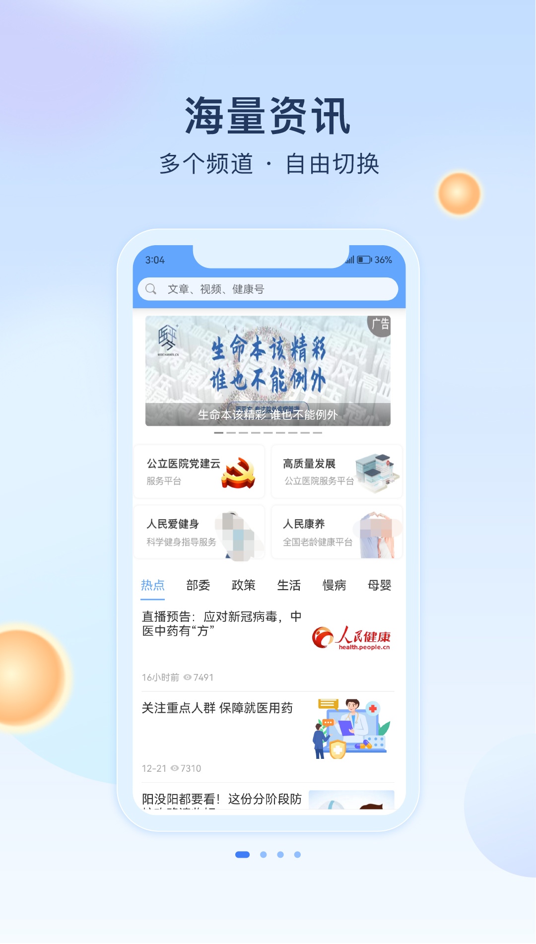 多个频道的资讯信息随意切换查看,医疗健康行业动态随意查看,包括慢病预防、中医中药、心理咨询和美容护肤等等,足不出户就可以与专家面对面的沟通了。