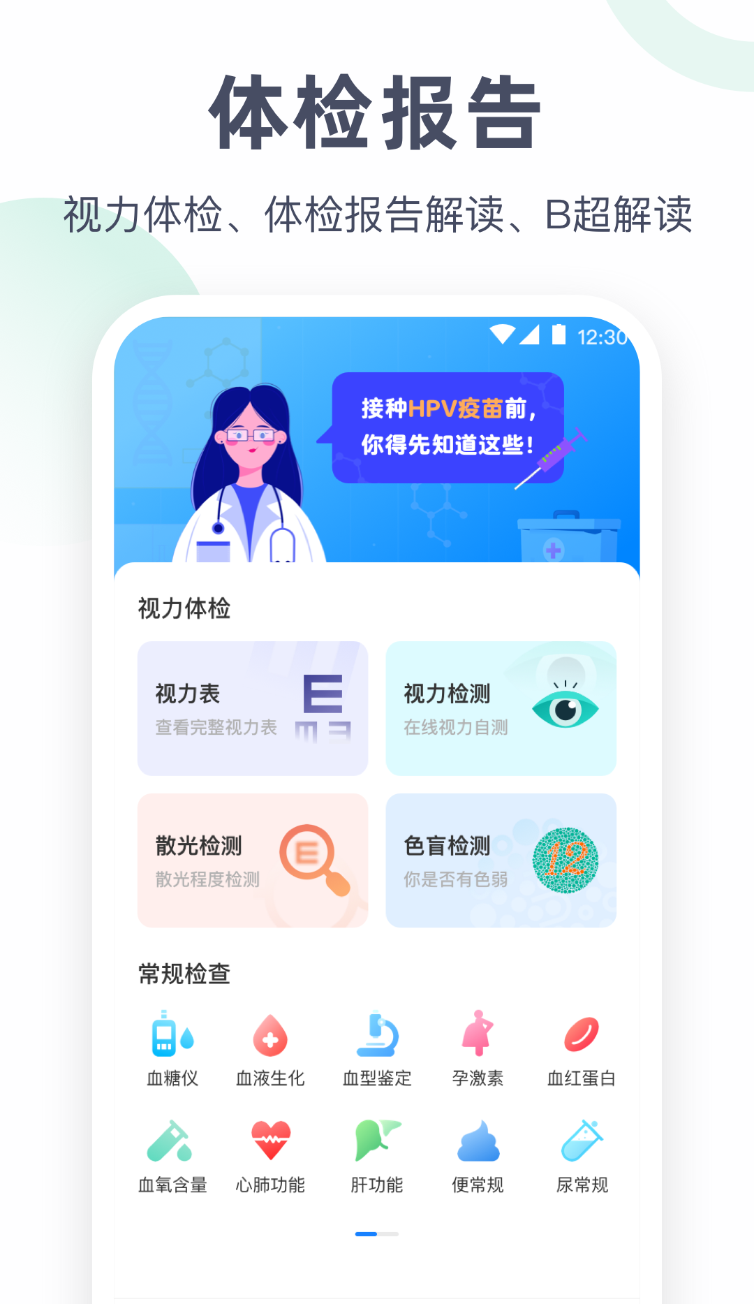 全国各地的疫苗查询,你在全国各个地方各个医院做的体检报告都可以查询,在APP当中也可以完成视力的检测,可以查看的内容丰富而且也会为大家保密其中的内容和信息。