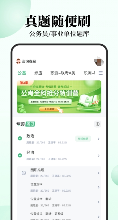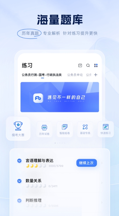 这里拥有最专业的公务员题库,为考公务员的小伙伴打造上岸的高质量神器,海量行测申题库,与全国真题与考试练习同步。