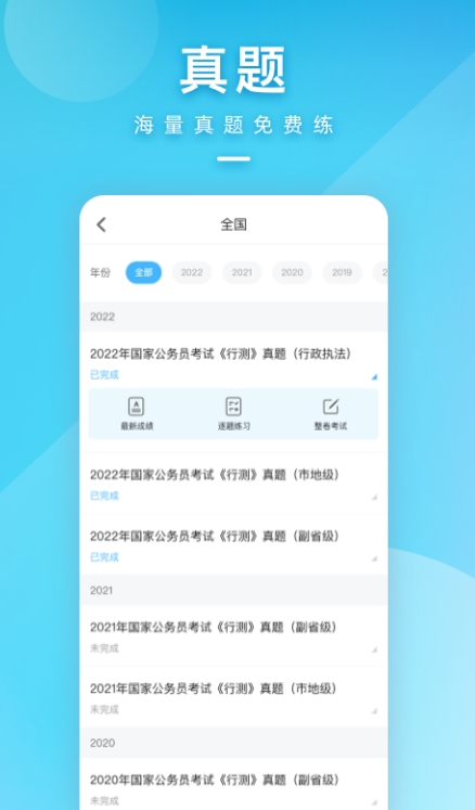这是国内领先公务员、事业单位备考的软件,集往年题库为一体,方便大家进行学习,同时可以模拟答题练习,答完以后可以查看PK中的真实水平。