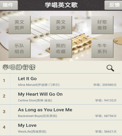 想要通过听歌的方式学习英语的话,这是一个非常专业的软件,通过经典英文歌对唱的方式,既能够掌握单词,也能够了解语法,也可提高英语成绩,里边有很多好听的英文歌曲,也可以通过搜索的方式获得。