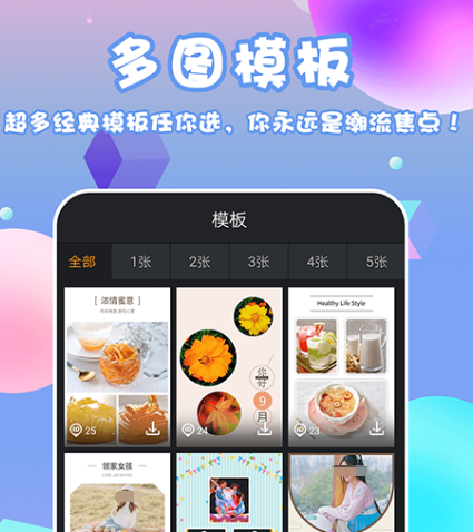 在制作手机海报时,有很多的人都是需要利用各种模板的,比如此软件它就拥有着众多的模板,同时还是多图模板,也有潮流的海报拼图模板,不管是美食菜单还是电影海报,旅行日志等等,可谓是应有尽有,满足想要制作海报人群需求。