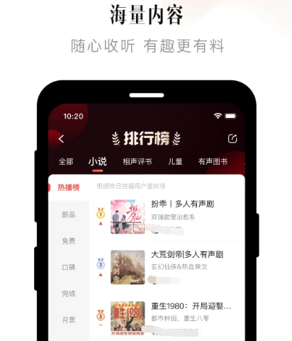 该软件拥有着超高的下载量,人们不仅喜欢在睡觉之前听故事,这里还有关于相声、评说、小品等等内容,是一个拥有很多好听声音以及风格多样种类齐全的,也可以多让孩子听一听软件里边的各种内容和声音。