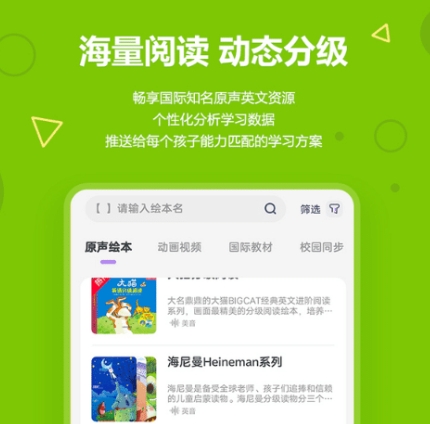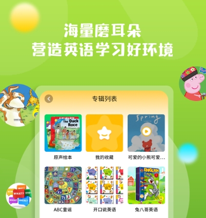 在这里大家能去解锁各类经典的英语绘本,让大家能去自由的学习了解,同时提供了英语启蒙以及智能化的语音评测体系,让用户能获得良好的体验,数千首不同的英文歌曲也会给到大家,让用户能轻松的感受英语带来的乐趣。