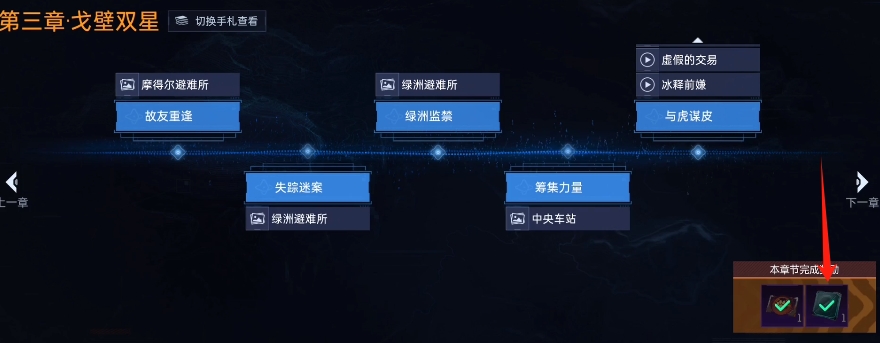 之后点进档案馆第三章的详情页面,在该页面的右下角可以看到一个本章节完成奖励,奖励包含两个物品,而其中有一个就是阿修罗蓝图,获取这个蓝图之后进行使用即可知道千鸟阿修罗的制作配方。