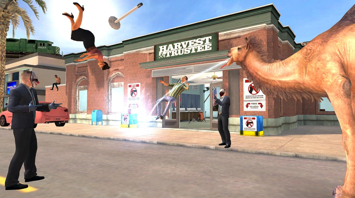 当然,这过程中一些具有执法能力的npc也可能会因此对你进行追捕,但你也可以通过各种意想不到的方式进行逃脱,比如开车,又比如变成能喷水的骆驼等等。