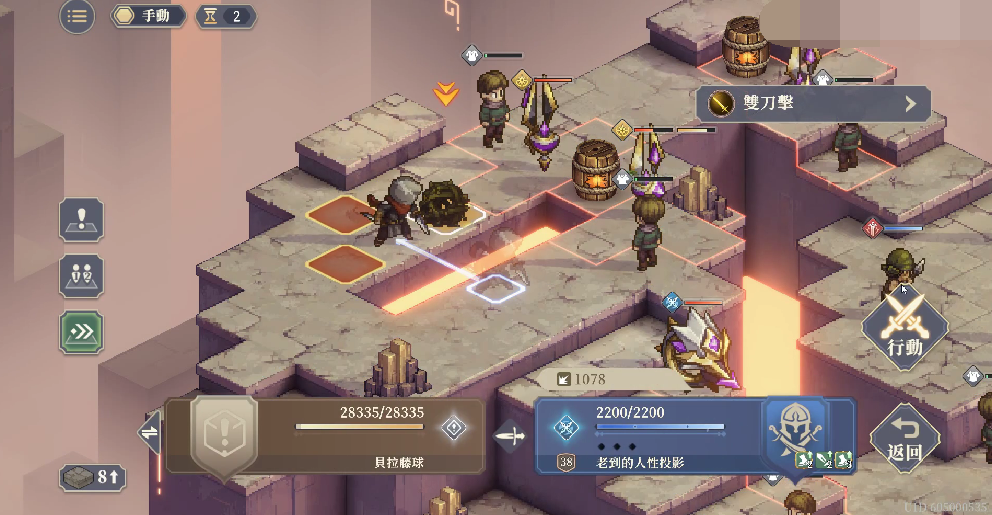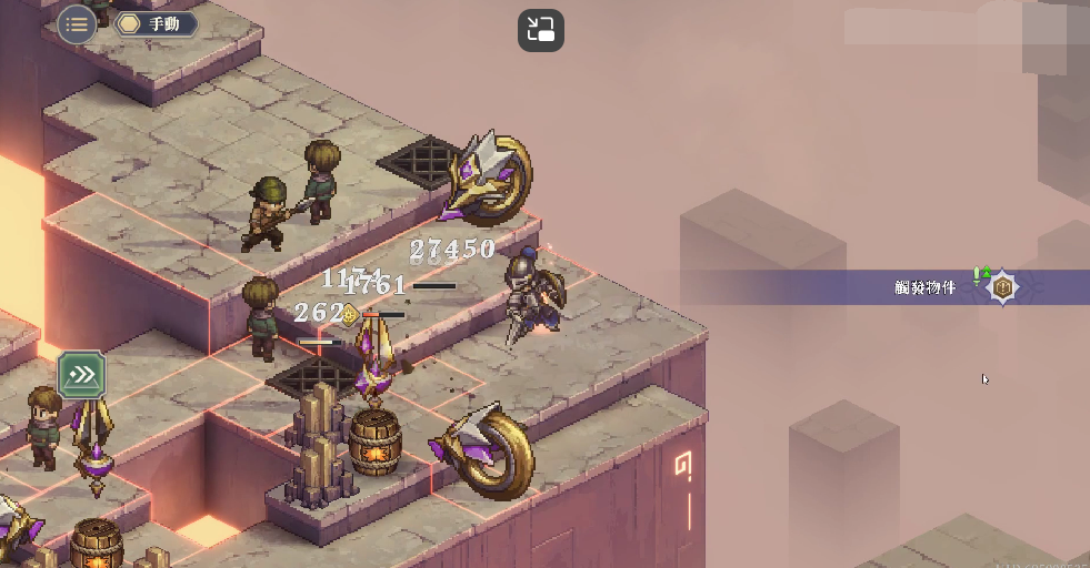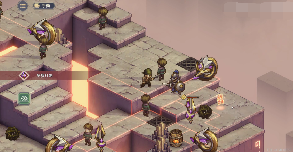 4-13-2的战斗分为两个回合,第一回合先让携带长枪的士兵发起进攻,直接将前方的道具推下台阶。在闯关地图的左上角会看见携带剑的士兵,直接跳越前方的陷阱,将右侧的独轮拉到士兵右侧的格子上,建议使用【钩锁】技能拉动。跳下高台,在死角这里有藤球,藤球是有攻击能力的,用【击飞】技能可以让藤球攻击前方的独轮,场上的木桶有攻击能力,每一次爆炸都可以造成高额的伤害,建议放在独轮的傍边。