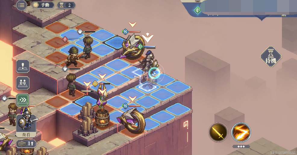 第二回合的通过与第一回合有相似之处,先让”无法者长枪兵“角色发起攻击,用【击退猛击】技能将右侧的机关移动两格,在悬崖的另一边是用勾子将左侧的机关拉下悬崖就行。战场上同样有藤球和木桶,与第一回合的使用方法是一样,但要先观察这两个所在的位置,距离过近才能造成更高的伤害。
