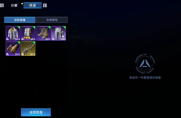 玩家们需要先回到庄园中,在庄园里面的门口,会刷新一些控制台,控制台中可以直接查看武器页面,在页面中就可以看到目前以有的装备,选中后,就可以看到修理按钮和分解按钮了,大家按照直接的需求来进行选择就可以了!