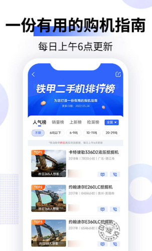 这款平台主要是以挖掘机为主的,可以看到全国上架的商品或者是选择附近的区域来进行筛选。会根据人气、销量等条件来进行产品排序,可以在详情中看到设备的具体参数和一些信息。