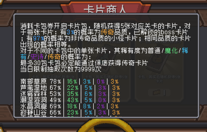 卡片商人的玩法也比较简单,玩家们需要使用【卡包卷】来进行抽奖,一张卡包卷是50蓝宝石进行兑换,不过玩家们在抽奖之前,最好是现把地图都通关了,在去进行购买抽奖,因为商店中的卡牌是根据玩家们通关的地图来进行分区的!