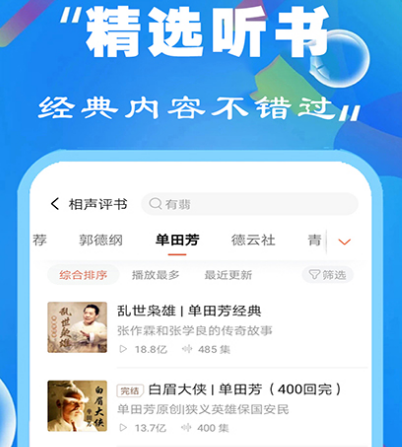 拥有5颗星好评的平台,上千万用户都在使用,小伙伴们可利用该平台免费听广播、听书、听课,几亿用户都在选择,有很多大咖入驻,比如郭德纲、高晓松、梁宏达等等。