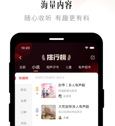 有5颗星好评的软件,免费畅享无限聆听,海量资源满足你的听书需求,涵盖小品、小说、历史、军事、穿越时空等。不仅可以听多人阅读小说,还可听儿童故事、曲艺戏曲。