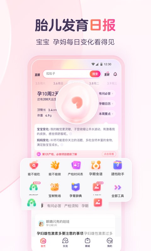 这款用于平台主要使用在怀孕,分娩以及育儿等方面,它能够提供简单的备孕知识,帮助大家提醒注意的事项,甚至包括饮食的禁忌等等,等到育儿的时候能够在平台上分享,科学的育儿知识,帮他祝大家进行早期的启蒙和教育,还能够监测儿童的状况。