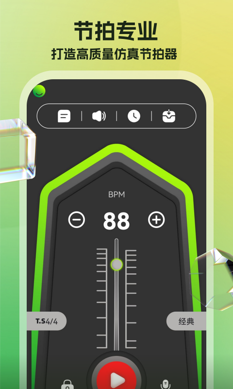 节拍器节奏这款软件是一款让学习弹奏乐器的用户们更好地增强记忆感觉的设备软件,借助这个软件够用户们能够有效地了解不同的节拍韵律体验,能够让各位用户的获得比较强劲的节奏感觉,可以运用于不同类型不同难度的训练,大家可以根据自己弹奏的水平来进行智能的调整,能够让自己实现稳步而专业的训练过程。