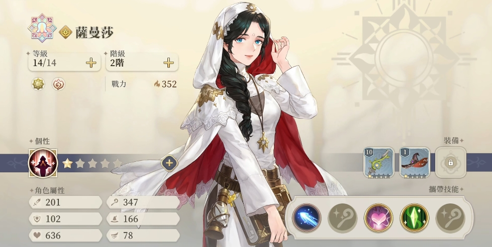 这个角色的个性技能是可以带来一个治疗效果的,她在用个性技能的时候可以对自己周边三个格子之内所有的队友都达到治疗效果,提升的比例是根据星级产生变化的,在一星二星的时候这个比例是能够达到20%的,而且如果这个时候队友被敌人攻击的话,并且之后正好进入受伤或者是病死的状态,那么这个时候萨曼莎马上就会消耗自己的能量值,来治疗这个血量危险的队友,当然治疗的数值是根据萨曼莎的魔法攻击数值其中40%来治疗的,这个技能的话还是可以多次使用的,所以近距离的队友生存有一定的保障。