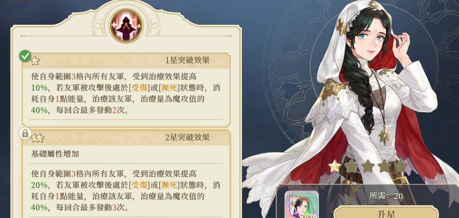 在达到三到五星之后她的治疗效果提升百分比会增加到30%,在初始技能上面是一样有治疗效果的,一阶的时候可以恢复能量,在三阶的时候就可以带来更强治疗的效果,主要是挨着自己两个格子之内的队友,治疗的数值都是魔法攻击数值的40%,当然如果是处在两个格子之内的中心目标,则还有另外的40%,治疗量合在一起这个中心角色的治疗量是80%,在治疗完之后,所有的队友还会获得一点的伤害,以及物理防御效果,可以持续两个回合的防御也是能够为队友带来一定的正面效果的。