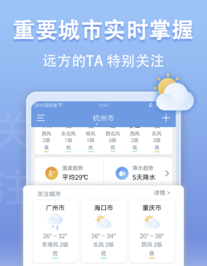 及时的更新当天的气温湿度还有空气的质量问题,每小时都会有更新,如果遇到下雨的天气也会进行预测,提前提醒小伙伴注意添加衣服带好雨具。