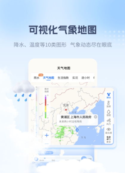 个性的设计让你拥有不一样的天气图标,系统里边会有短时间的降雨和降雪推测数据,可视化的云层搭配地图让大家看的更加真切,精简的界面操作起来十分的方便。
