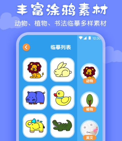 它是一款适合大家去随时随地画画的软件,在里面提供了丰富的涂鸦素材,对于一些刚刚开始学习画画的用户而言, 它也能提供帮助,不论是动物还是书法的临摹,都能在里面轻松的实现,整体功能强大。