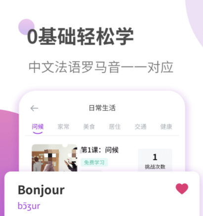 帮助大家快速入门的法语学习软件,从音标慢慢的开始,真人的精准发音帮你纠正每一个错误的地方,各种不同背景的对话更能提升你的听力问题。