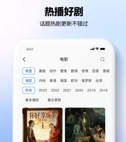 这里既有热播的影视作品,还可通过年代、地区类型等等来选择自己喜欢看的,比如在电影这一个板块里就有很多的选项,既有犯罪题材的,也有爱情、喜剧类型的等等。