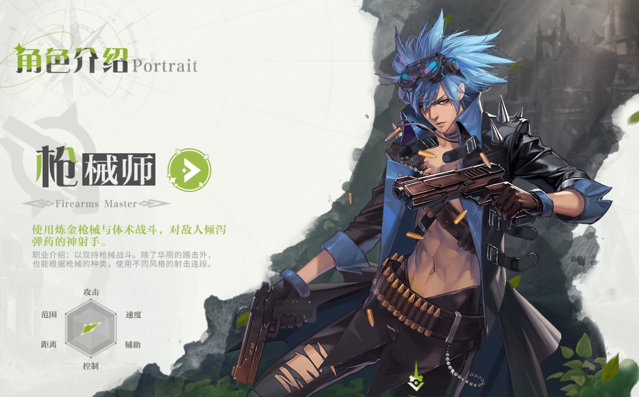 枪械师:这是利用枪械和体术进行战斗的职业,本身手持双枪,外形上十分潇洒飘逸,除了能够通过枪械进行不间断的远程射击以外,它还可以通过技能来释放踢击,这样就不怕敌人近身切自己了。