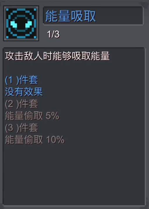 第二个需要凑的羁绊是“能量吸取”,它可以让你在攻击敌人时吸取能量,这个能量吸取效果在二件套和三件套的时候都十分不错,不过建议还是直接凑满三件,10%的能量偷取配合技能窃法之刃可以让你在持续释放旋风斩的过程中完全不缺能量。
