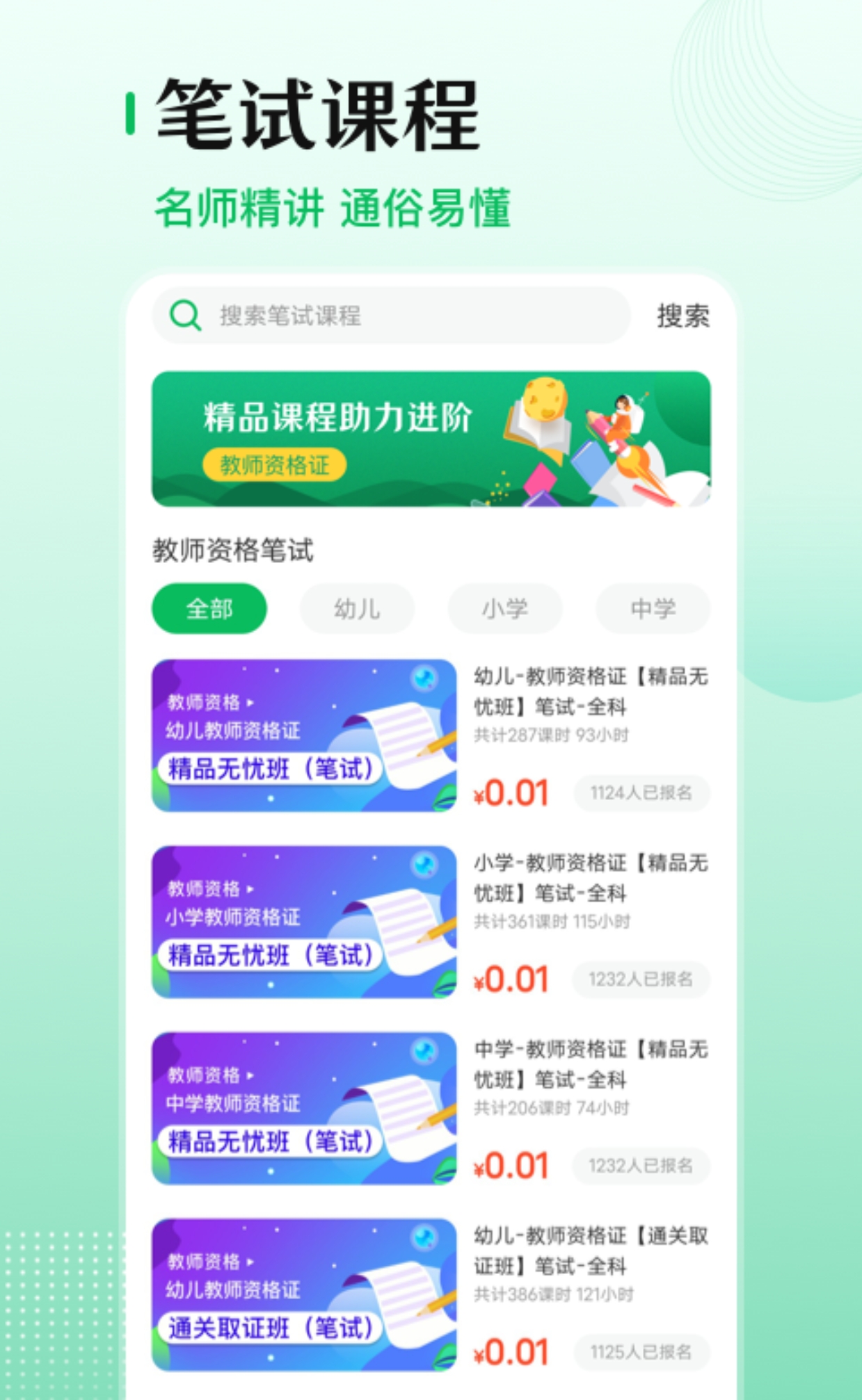 软件内包含所有的关于考试的内容,比如考试资讯,笔试面试答题等。在该软件里,你可以享受到高级名师的精品课程,可以对点练习,可以让你有目的的攻克重难点、疑难点。在该软件里你还可以学习到各种考试小技巧,便于你在考场上发挥出你的最大水平,考出最高分!笔试面试一体化,帮助你一次性通过教资考试!
