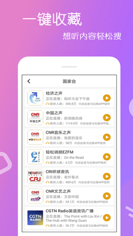 这里收录了国内各个主流的电台节目,你喜欢哪个直接点击播放就可以收听,没有任何的限制,也不会有广告的插播,美妙的声音还可以跟主持人进行互动。
