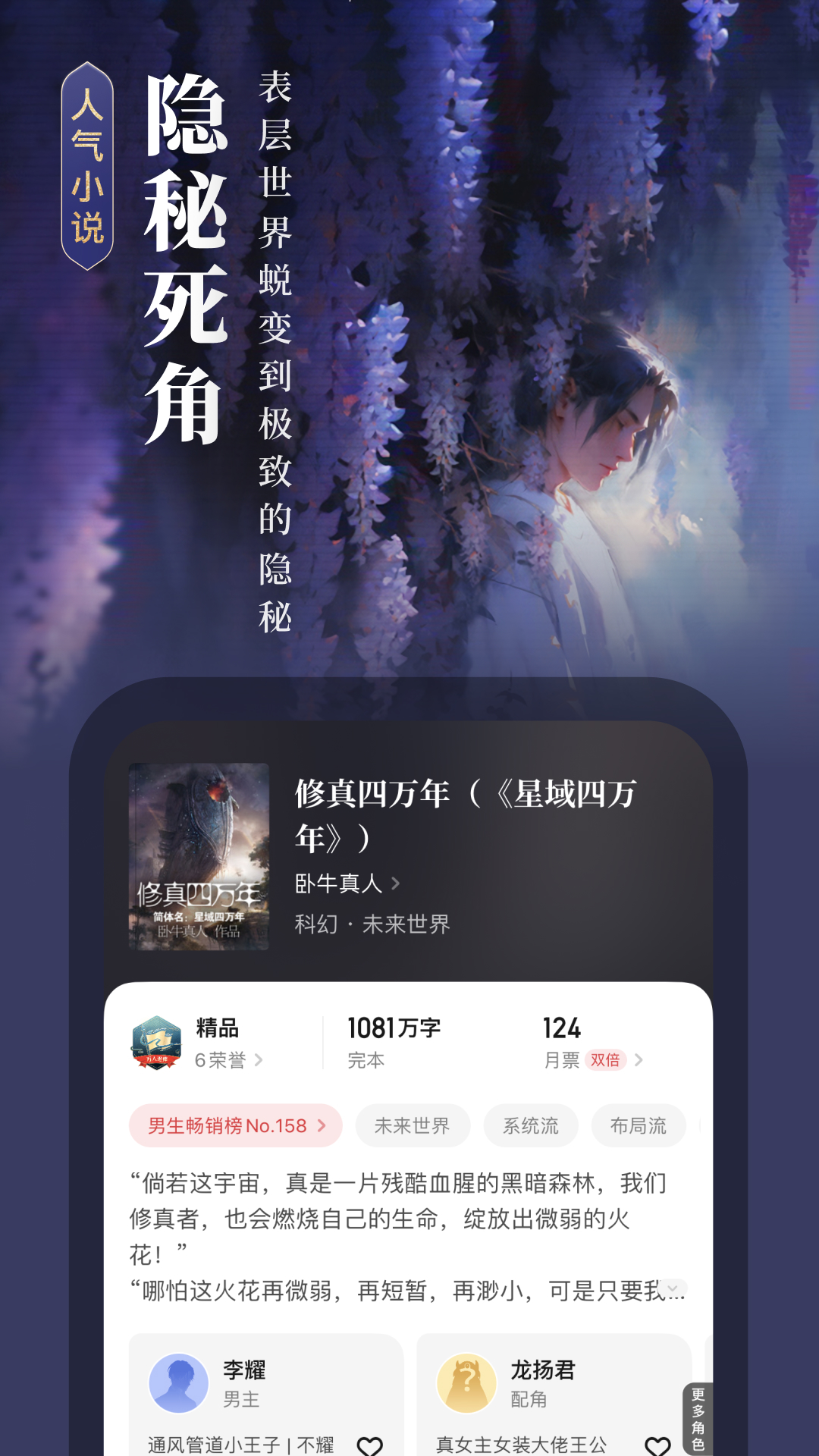 凡人修仙传属于热门修真大作,它属于凡人流类型的开山之作,呈现了快速修仙的历练之旅。本文小编带来凡人修仙传小说免费阅读软件推荐。精品小说类阅读软件整合几百万作品,更新速度快,智能推荐不同类型小说,用户们从此告别书荒,流畅阅读热门IP。