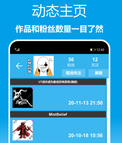在这一个绘图软件里,它不仅能够绘制像素风格的作品,除此之外在动态主页当中还能够看到自己的作品以及粉丝数量,在进入绘图模式以后,不仅支持128像素绘图,还拥有着丰富的工具,在完成了以后也可导出相册,分享微信上传作品。在动画模式当中可以制作出短片以及gif表情。