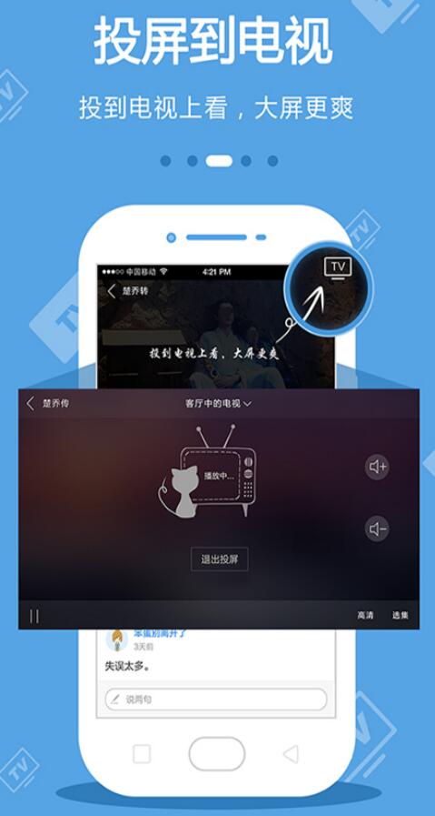 在手机上追剧,受限于屏幕尺寸,看起来比较费眼睛,这时,用户可以操作app,把正在观看的内容,直接投屏到电视上面,用更大的屏幕去欣赏视频内容。