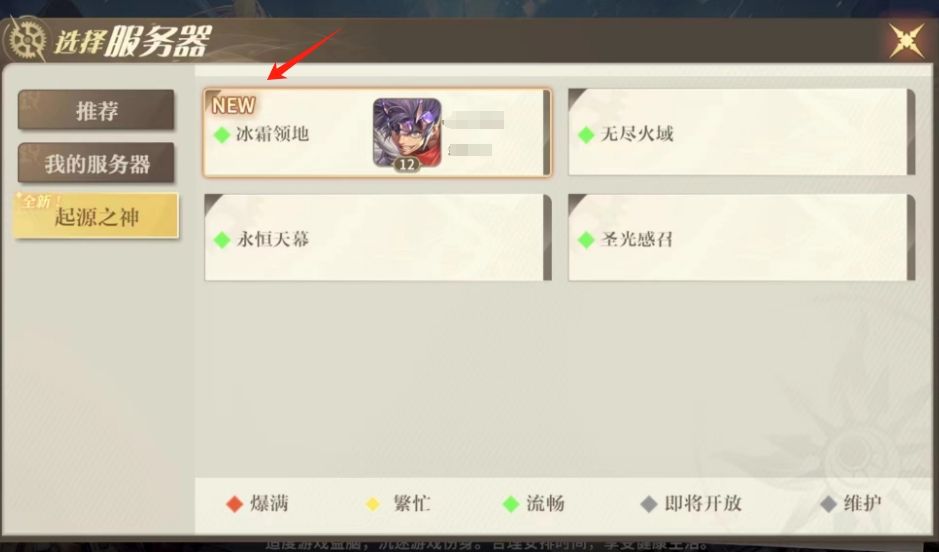 在选择服务器的时候也可以多观察一下,一般新区刚开的这几天它的左上角都会有一个与众不同的“NEW”标识,通过进入该区你既可创建新的角色,需要注意的是你以前其他区的老角色不会被加入新区的存档,它每隔区都是独立的存档,并且初始开放的创角栏位数也会重置到3个。