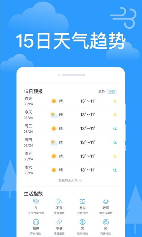 有的人希望了解未来15天的天气趋势,这样当自己外出的时候就可以准备的更加从容,这样你就能够提前准备好相关的衣服,例如天气晴朗的话就穿短袖,如果下雨天比较多的话就穿外套或者长袖,并且还会公布当天的空气质量以及污染程度。