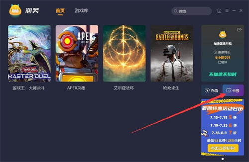 1.先启动泡芙加速器来到首页界面,上图所示位置点击“卡券”功能;