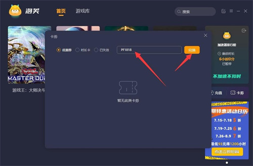 2.在卡券界面的输入框里面填入CDK【PF1818】,点击旁边的兑换按钮;