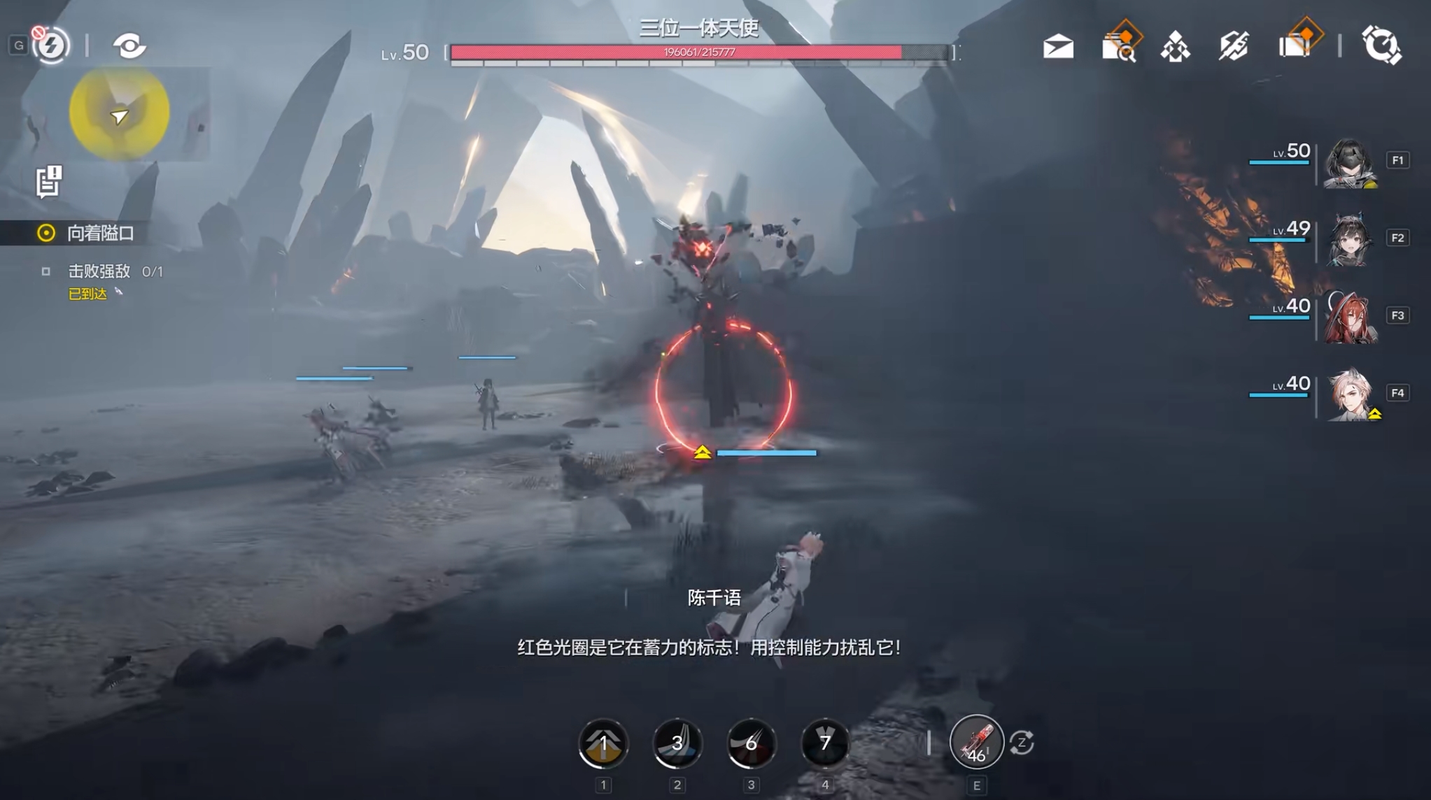 三位一体天使共有三个阶段,其第一阶段会释放三种红圈技,既天使身上会出现红圈图标。三种红圈技分别为圆形斩击(双臂放低时)、两道劈砍(整体呈Y字形),冲撞(整体缩成火箭型),并且伤害都会附加眩晕判定。若是玩家没有打断技能,可在天使攻击前摇时远离它,等它释放完攻击后再近身。但最好的处理方式是在其前摇时放打断技能打断,并趁机对天使进行集火输出。