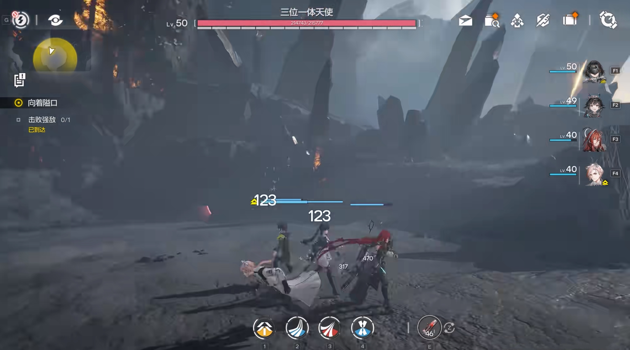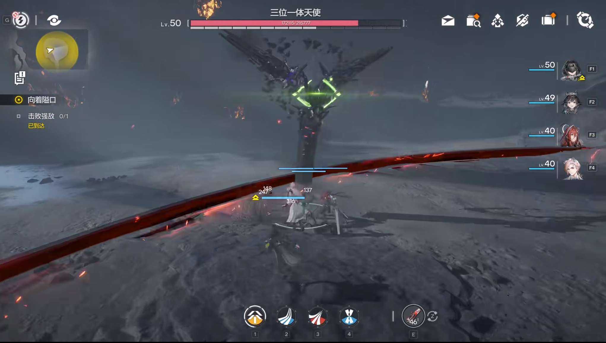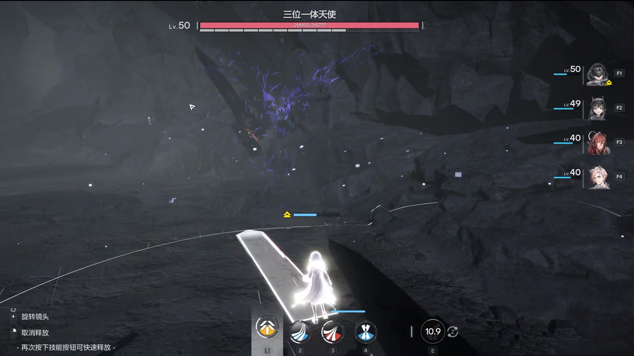 第三阶段时,天使开始就会进行隐身,玩家只有通过AOE技能才能让它再次显形(需命中后才解除),同时这一阶段会释放追踪弹和多端球形的特殊攻击,玩家要时刻注意AI控制的队友血量,及时用回复技能或药品让队友的血线保持健康,避免暴毙。往后玩家只需不断逼迫天使显形,以此来削掉它的韧性条,就能慢慢将其血量打低,直至通关。