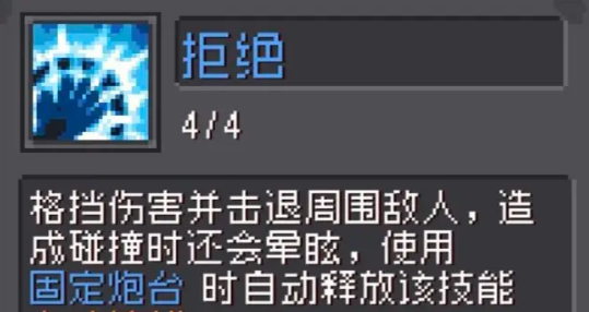 而原基础的炮台射速不太高,所以为在强化炮台伤害,让堡垒的作战能力更加的强,那么就需要点上副系的被动技能【火力全开】,当击杀敌人的时候,炮台攻击释放的投射物数量会增加,虽然这个是概率的,但是点数加满4点后,伤害就会非常的高;为了保证炮台的输出稳定一些,使用【拒绝】技能,开启后,可以格挡一些伤害,同时会让靠近的敌人受到击退效果,而且在敌人被撞击的时候,还会眩晕,这个技能在玩家们使用【固定炮台】的时候,是会自动释放的,而且是一个主动技能,所以这两个搭配起来是非常重要的!