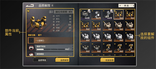 需要注意的是,同品质指的是部件左上角的星级标记,从最低到最高分别为蓝1星-蓝2星-紫1星-紫2星-金1星-金2星-金3星-炫彩,刚获取的紫甲和金甲分别为紫1星和金1星,品质解放一次就是把这个星标升1次,因为只能升级3次,所以蓝甲最高只能升到紫2星,紫甲最高只能升到金2星。同类型指的是轻、中、重这三种机甲类型。