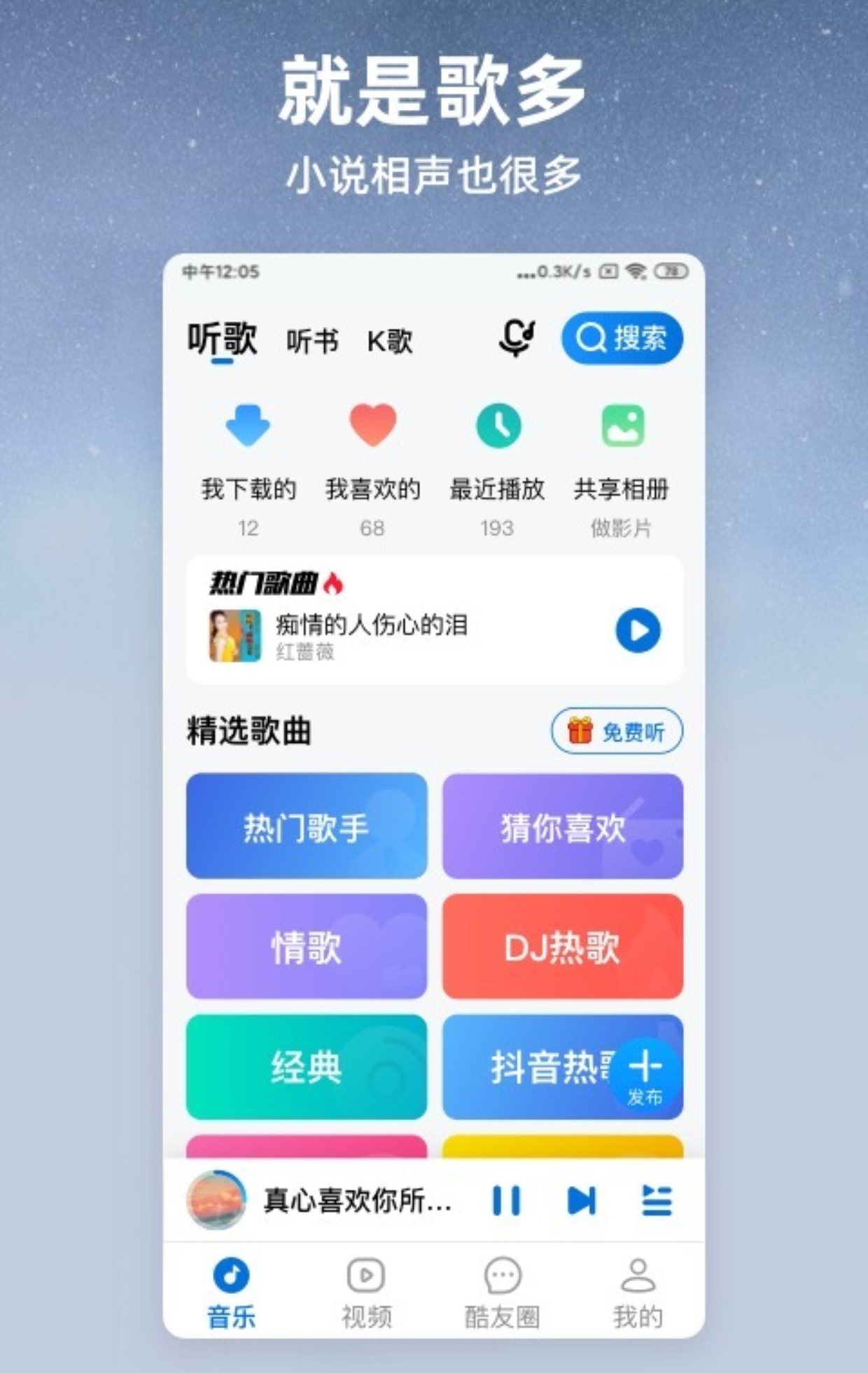 酷狗大字版界面内字体很大,非常适合视力不好的人群使用。酷狗大字版的音乐资源非常丰富,涵盖了流行、民谣、红歌等各种类型的音乐。它还支持语音搜索功能,只要说出歌曲名字或歌手名字,就可以快速找到相应的歌曲。让你的休闲时光被音乐充满,另外也支持下载功能,让你没有网络也能听到你喜欢的歌。