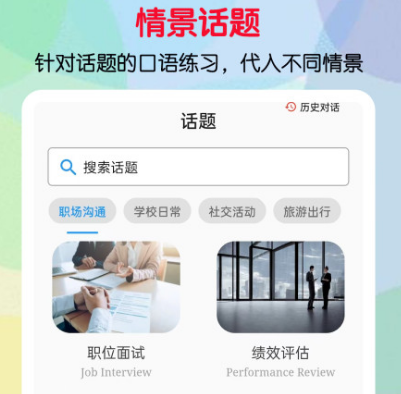想要练习口语的你,该平台满足一系列需求,其中有专业的老师与你进行口语对话,多个场景话题带入不同的口语场景,具有更衣模式以及跟读模式,贴心指导,语音实时识别,还有翻译录音回放,支持短文听力、练习短文,包含多种不同的内容,包括工作、社交、旅游等等。