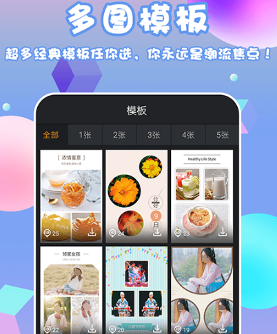 潮流海报拼图简洁又高效,只要动动手指即可立马呈现,海量创意布局有潮流贴纸、背景、字体等等,有多种不同的比例,可直接套用模板,满足所有照片拼图需求。在拼图时高达18张相片一键轻松拼图,有上百种网格布局,海量背景贴纸、高级滤镜、调节亮度、饱和度。